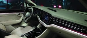 Các màn hình trong khoang lái của VW Touareg 2023 đều có kích thước lớn, gây ấn tượng mạnh về trải nghiệm thị giác. Không gian cũng mang lại cảm giác thư thái khi được thắp sáng bởi hệ thống đèn nền Ambient light 30 màu với 2 dải sáng song song chạy dọc táp-lô.